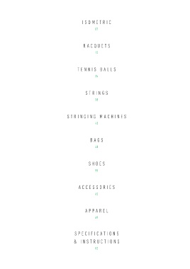 I S OM E T R IC 07 R A C Q UE T S 12 TE N N I S B A LL S 35 S T RI N G S 38 S T R IN G IN G M A C H IN E S 45 B A GS 48 SHO E S 55 A C C E S S O R I E S 62 A P P A RE L 69 S PE C I F IC A T ION S & I N S T R UC T I O N S 82